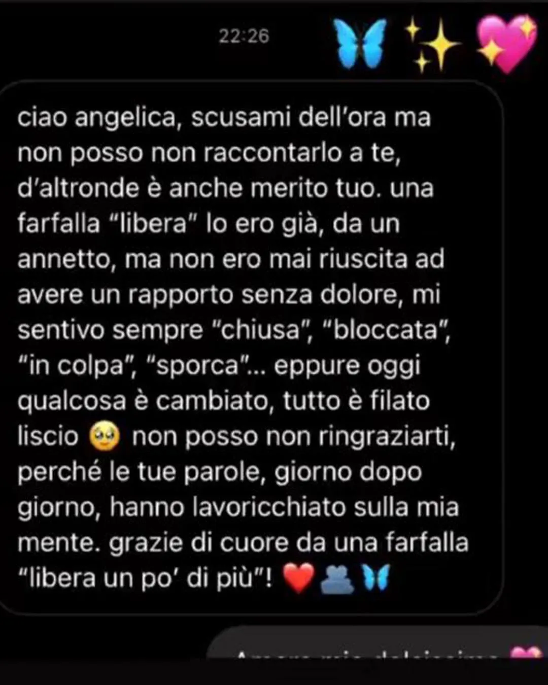 Oggi posso dire di esserne uscita. Mi sento una DONNA LIBERA, non solo sessualmente, ma anche nella mia vita e nella mia autostima.”